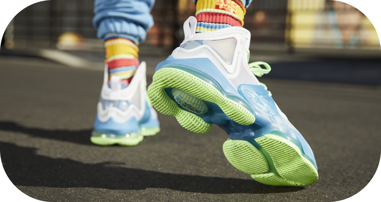 Multi-color design with graphics to represent LeBron James on the court